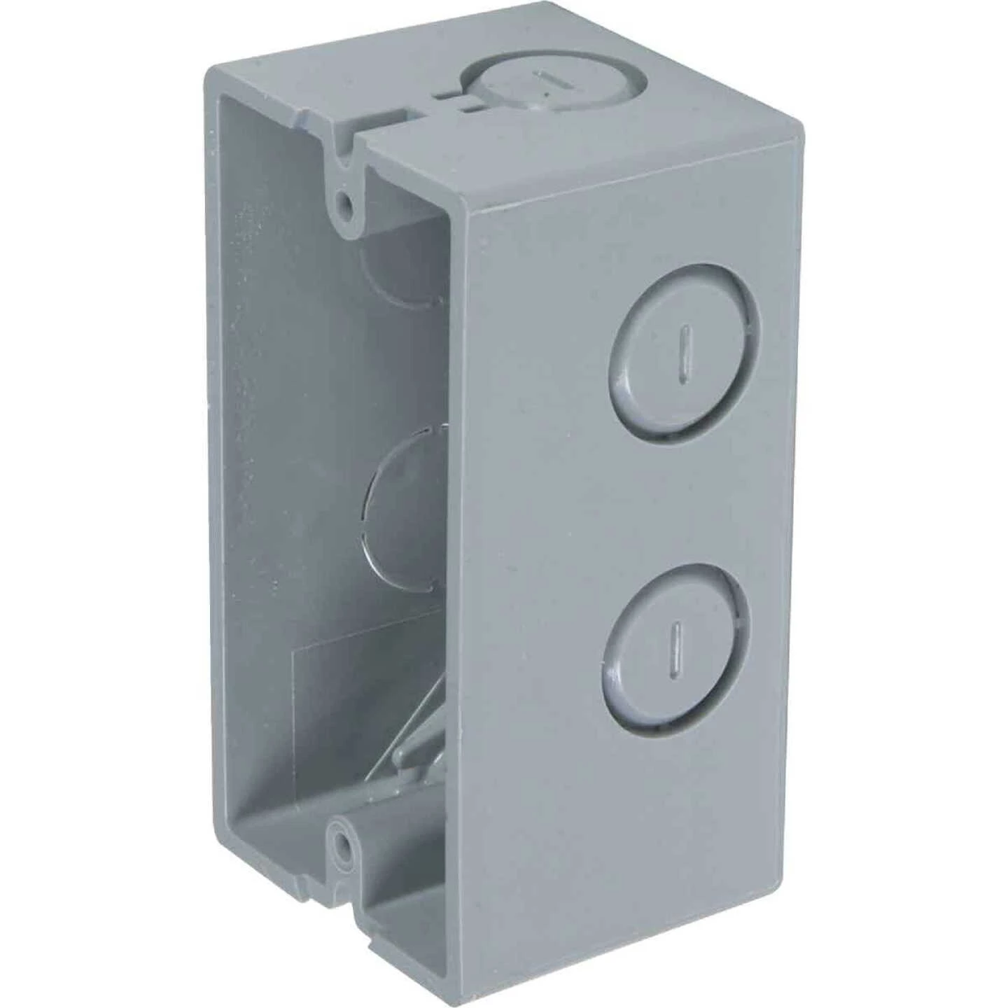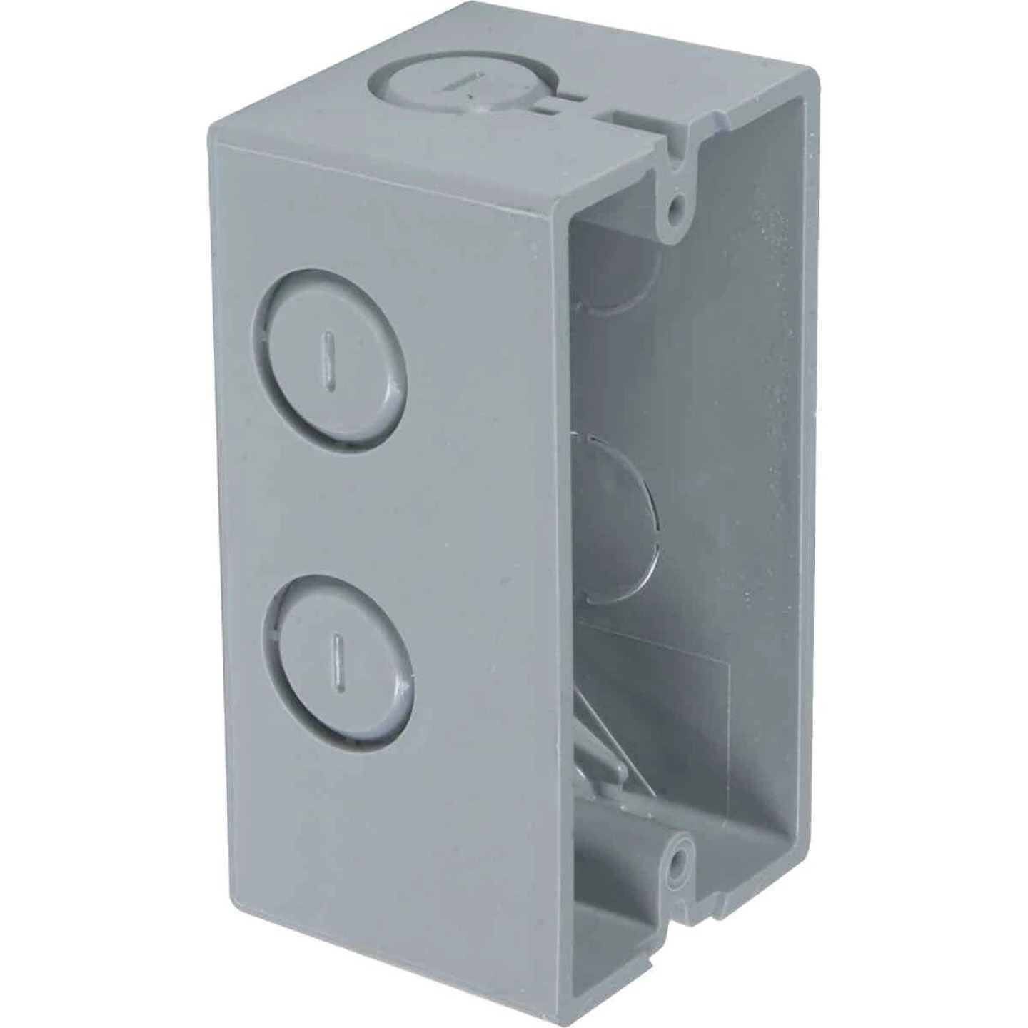Gray PVC (polyvinyl chloride) handy box. Ideal for surface mount installation where studs or joists are unavailable. For use with non-metallic conduit systems and non-metallic sheathed cable. UL (Underwriter’s Laboratories) listed.