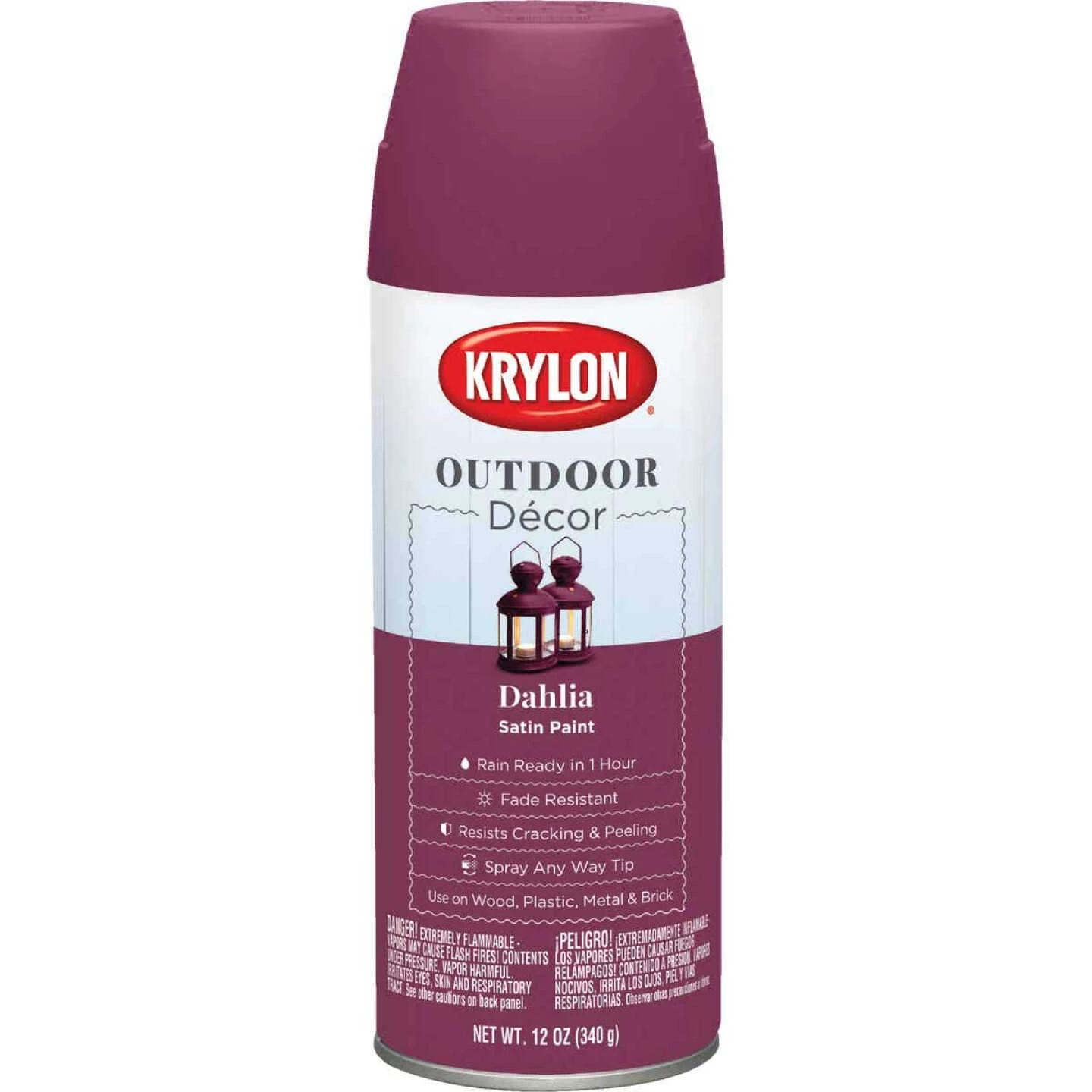 Refresh outdoor spaces with the bright and bold satin finishes of Krylon Outdoor Decor. Easily customize and complete outdoor projects both big and small, ranging from mailboxes and planters to Adirondack chairs and benches. Provides rust protection, along with a chip resistant durable finish that will withstand harsh weather conditions. Fade resistant, resists cracking and peeling. Dry to touch in 25 minutes. Rain ready in 1 hour. Recoat after 48 hours. Use on wood, plastic, metal, brick, and terracotta. Spray any way application tip. Lacquer thinner clean-up.